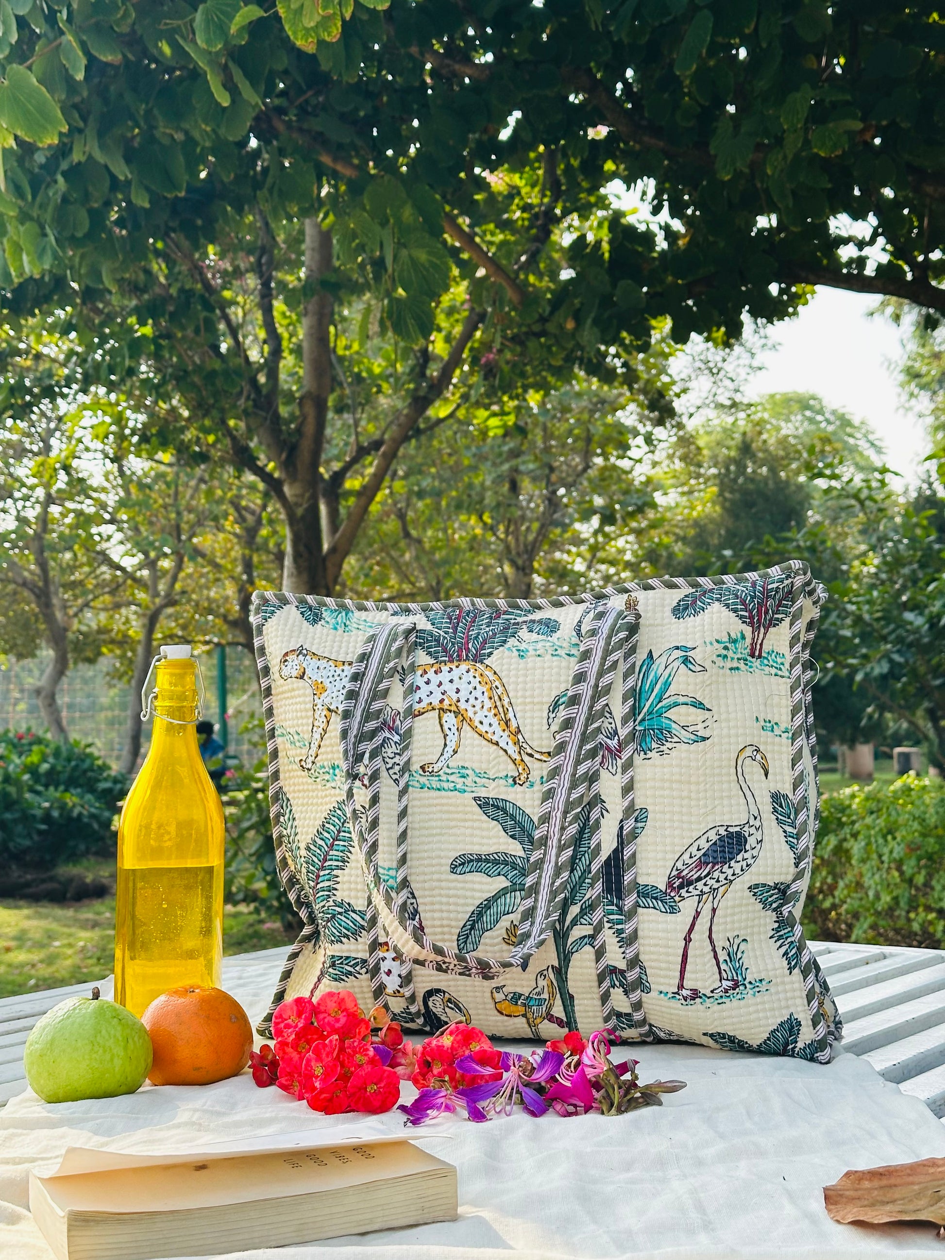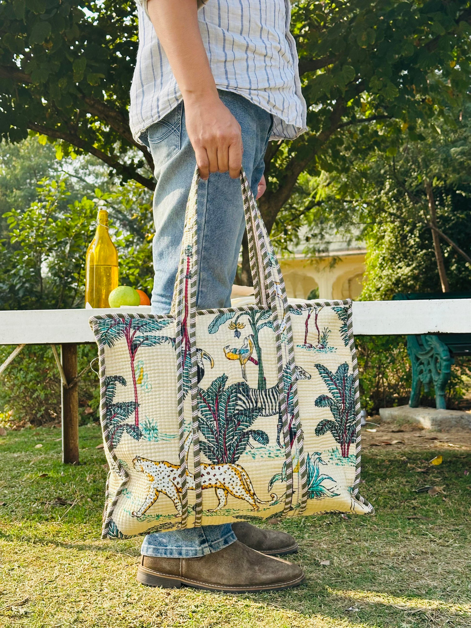 Inspired by the beauty of untamed jungles, this handcrafted quilted cotton tote bag features elegant bird and leopard motifs set against a soft ivory background. The detailed tropical foliage and wildlife illustrations create a refined yet playful aesthetic, perfect for everyday use.