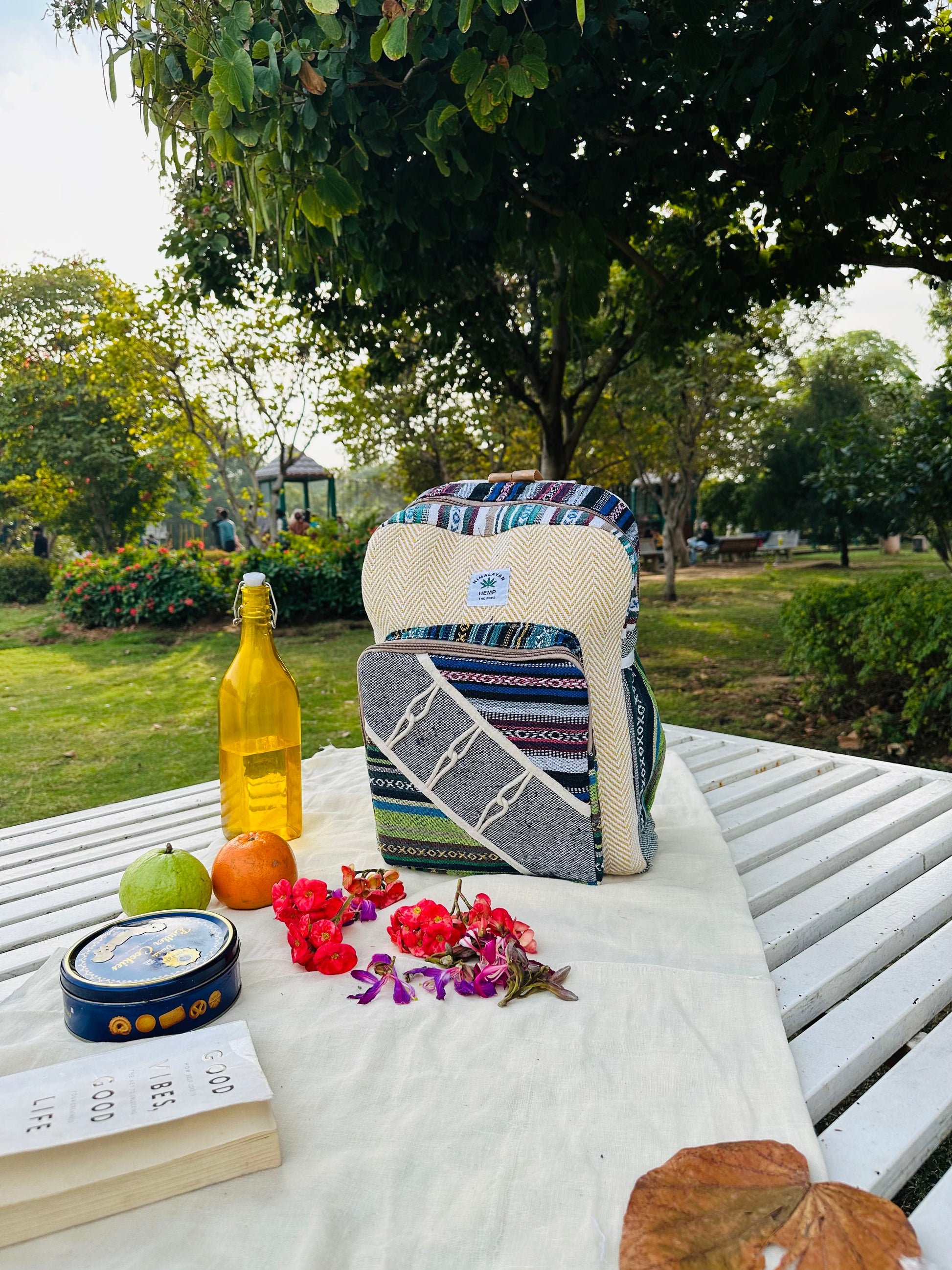 Eco-friendly hemp backpack with a beige chevron panel and multicolor ethnic weaving. Handcrafted, sturdy, and designed for everyday comfort with a distinctive artisanal look.