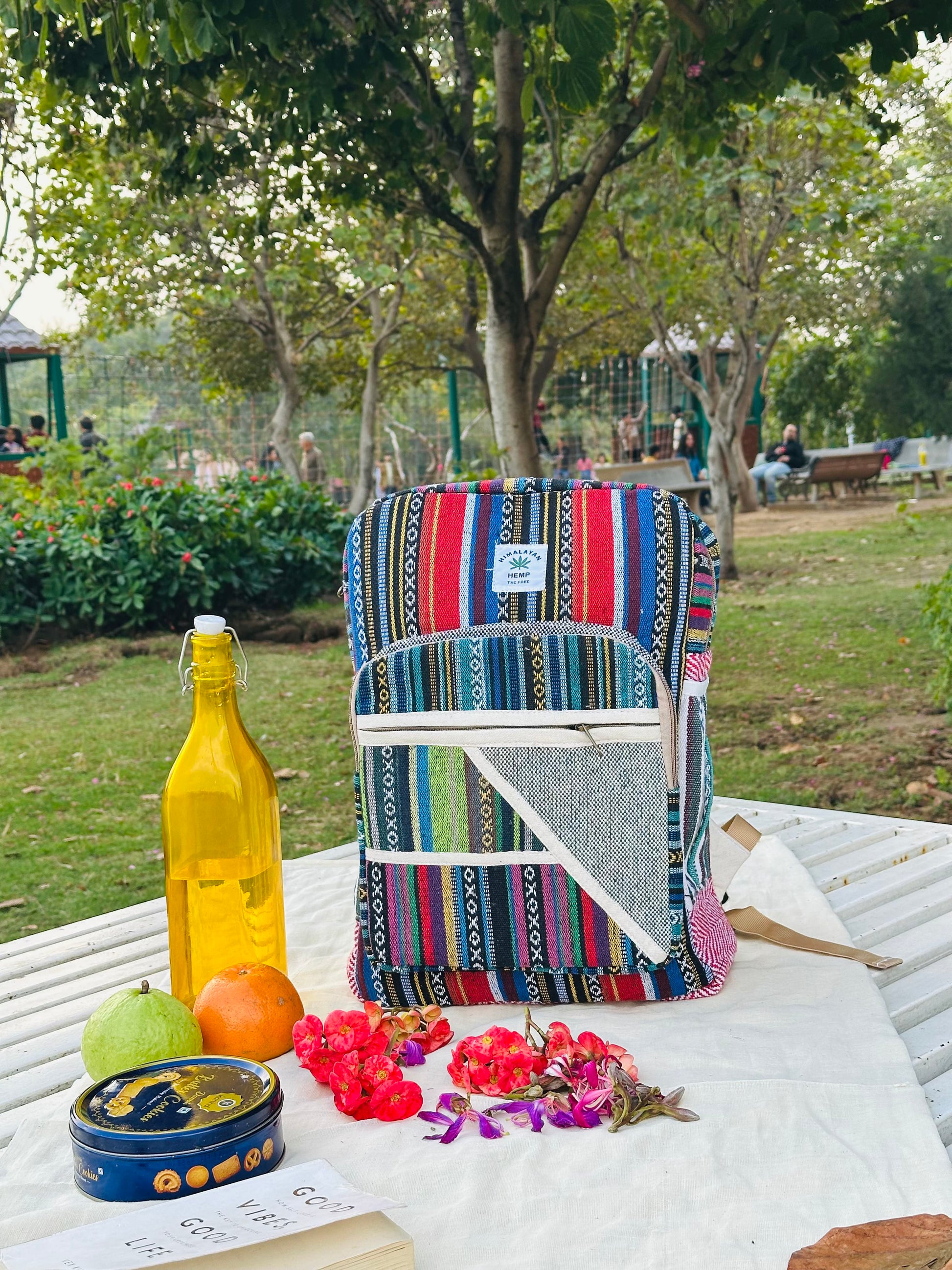 Eco-friendly backpack handcrafted from natural Himalayan hemp, featuring vibrant ethnic weaving and a functional front pocket. Durable, lightweight, and ideal for daily use, travel, or college with a sustainable boho appeal.