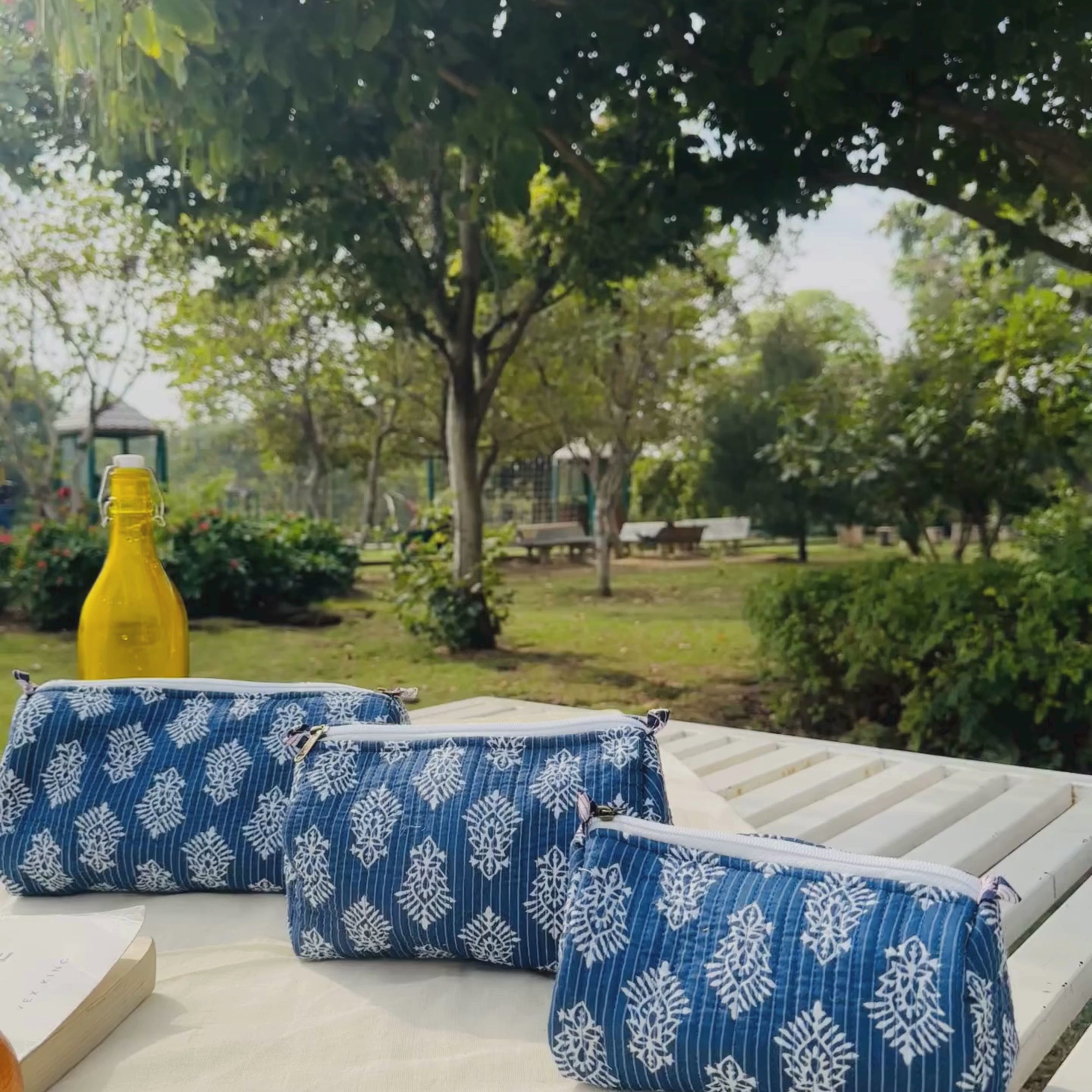 This Quilted 3-Piece Pouch Set comes in classic block prints and soft cotton fabric. The deep indigo-blue base with white traditional motifs gives it a timeless, handcrafted look. Each pouch is neatly stitched, lightweight and easy to carry. Perfect for travel, makeup, or daily essentials — practical, elegant and made to last.