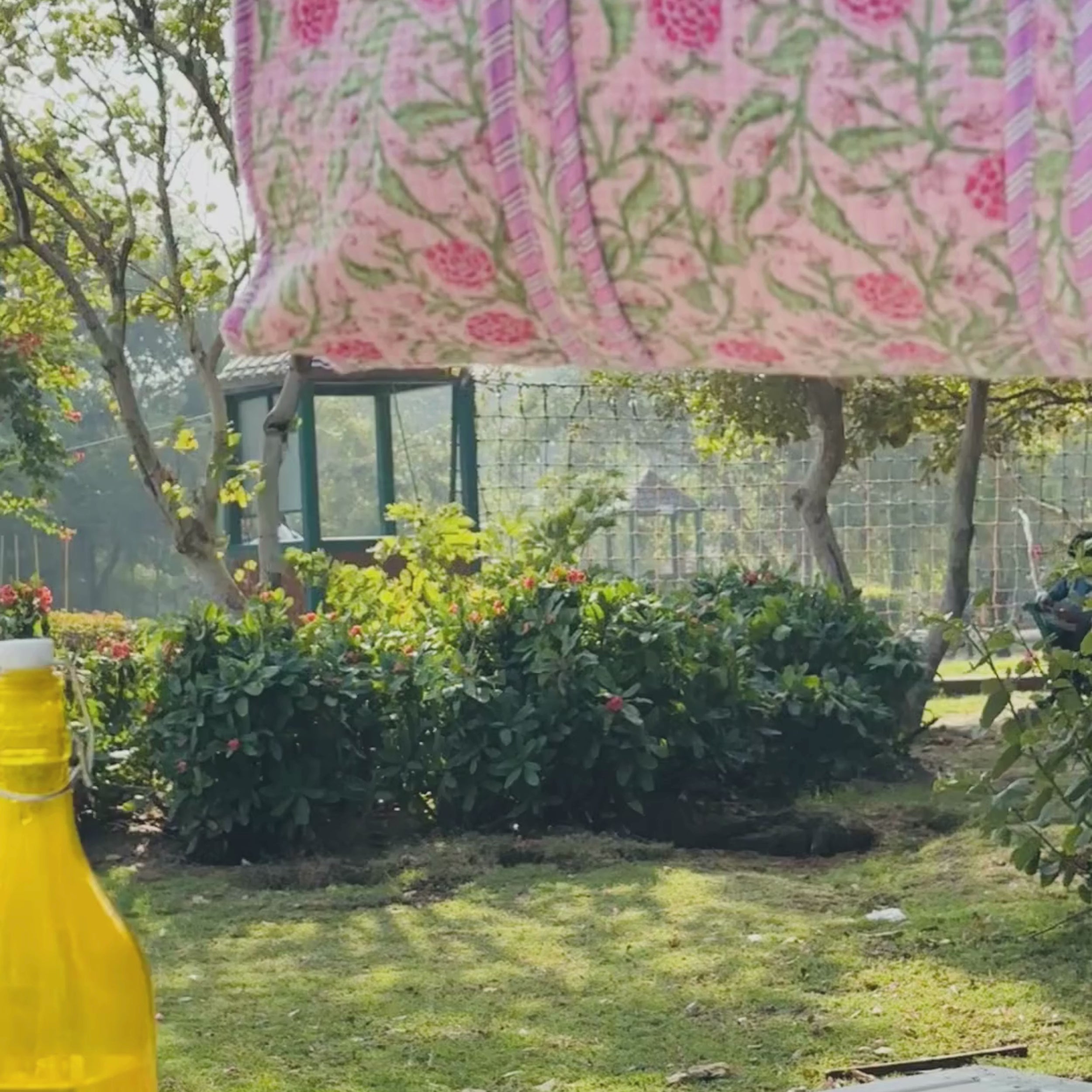 This quilted cotton tote bag is crafted in soft cotton with a delicate floral print. The soft pink base with detailed floral vines gives it a fresh, elegant handcrafted look.